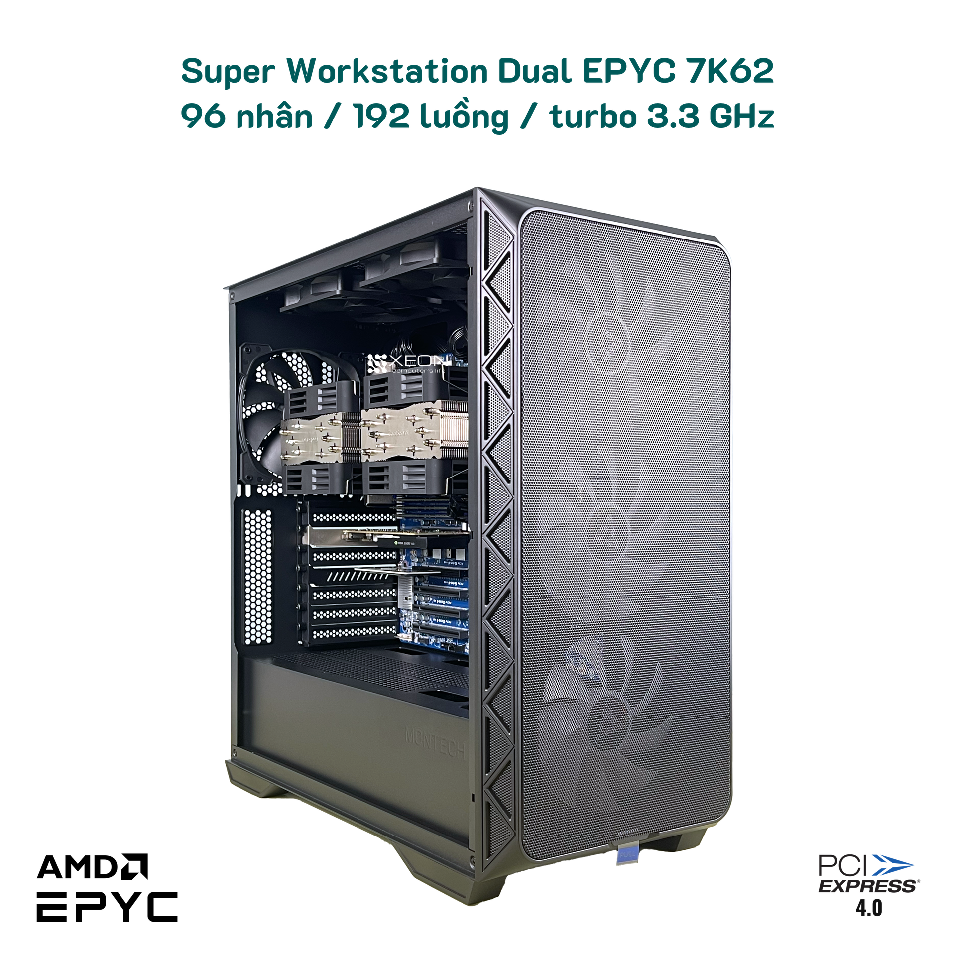 Máy trạm hiệu năng cao được xây dựng dựa trên 2 CPU AMD EPYC 7K62 (48 nhân – 96 luồng mỗi CPU), tổng cộng 96 nhân và 192 luồng xử lý. Thiết kế chuyên nghiệp, phù hợp với tác vụ cần hiệu năng đa nhân mạnh mẽ như: mô phỏng, render, AI/ML, ảo hóa, xử lý dữ liệu lớn…