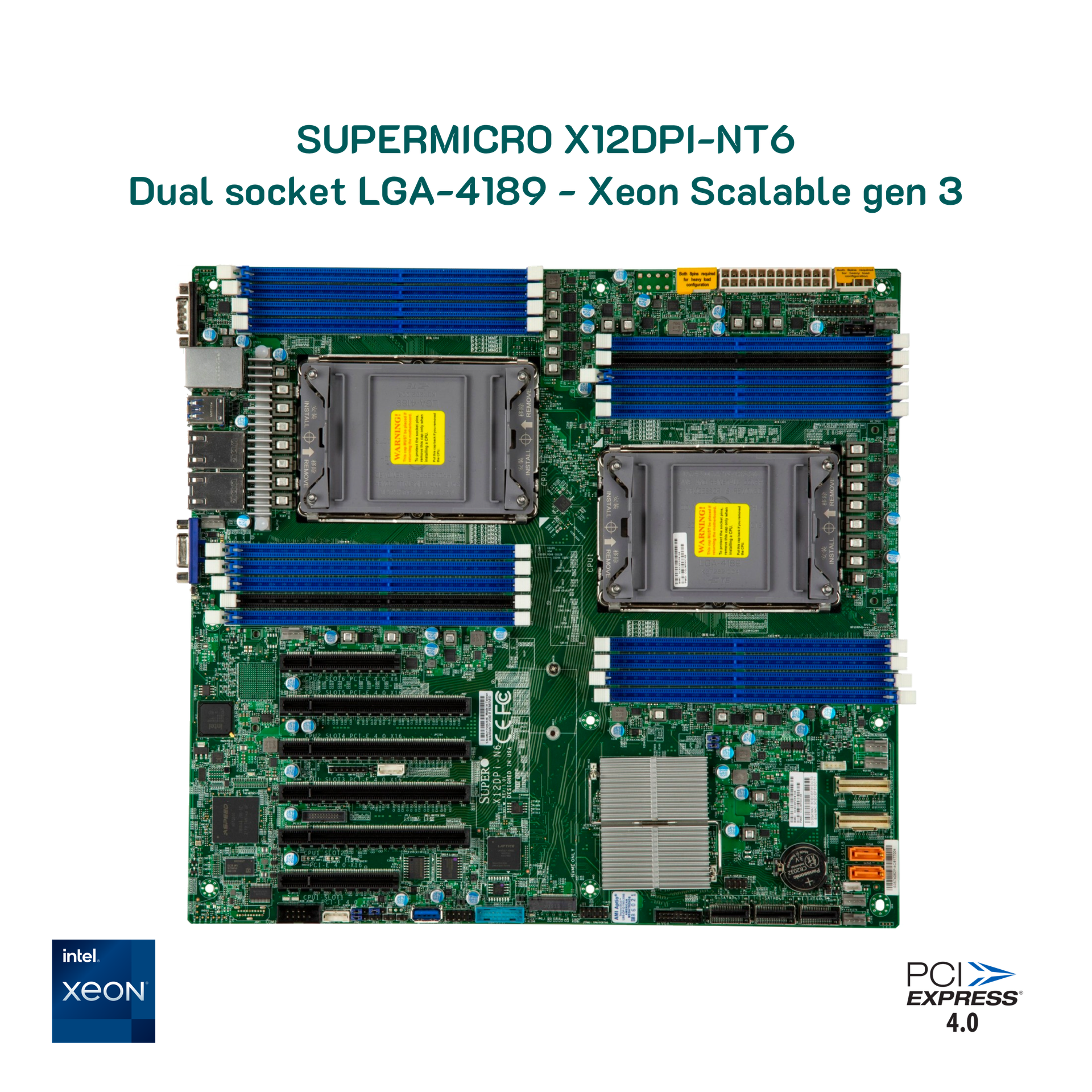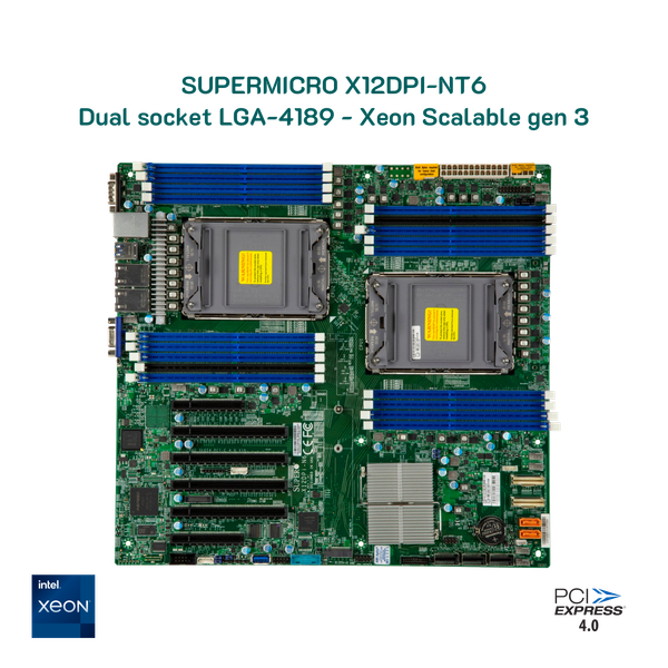 Bo mạch chủ Supermicro X12DPi-N6 hỗ trợ dual CPU Xeon Scalable thế hệ thứ 3 - socket 4189 - với 18 khe RAM DIMM đem đến bộ nhớ khổng lồ đến 4TB.