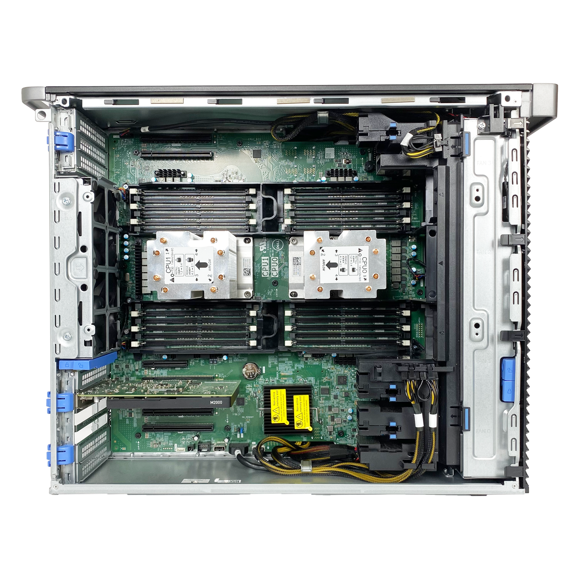 Bên dưới air-shroud là khu vực CPU và RAM. 2 CPU Xeon Scalable được nằm dưới các ống dẫn nhiệt lớn và heatsink.