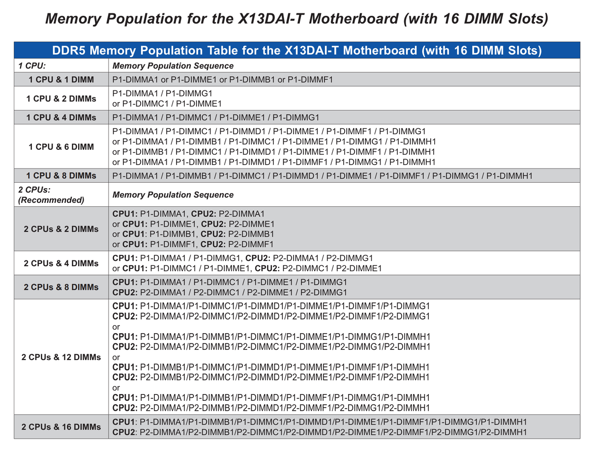 Supermicro X13DAI-T được trang bị chipset Intel C741, hỗ trợ bộ nhớ lên tới 4 TB 3DS RDIMM/RDIMM DDR5 ECC với tốc độ lên tới 5600 MT/s trong 16 khe DIMM.